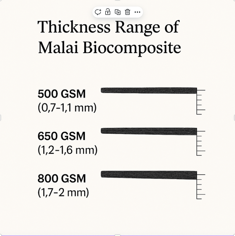 Malai Biocomposite is a material produced in format of sheets composed of Bacterial Cellulose, fibres from Banana stem, Hemp fibre & Sisal fibre and other purely natural ingredients.